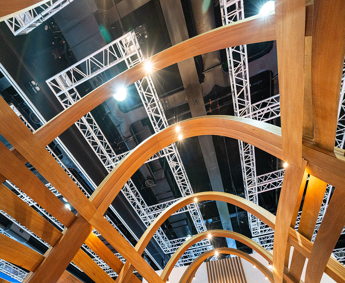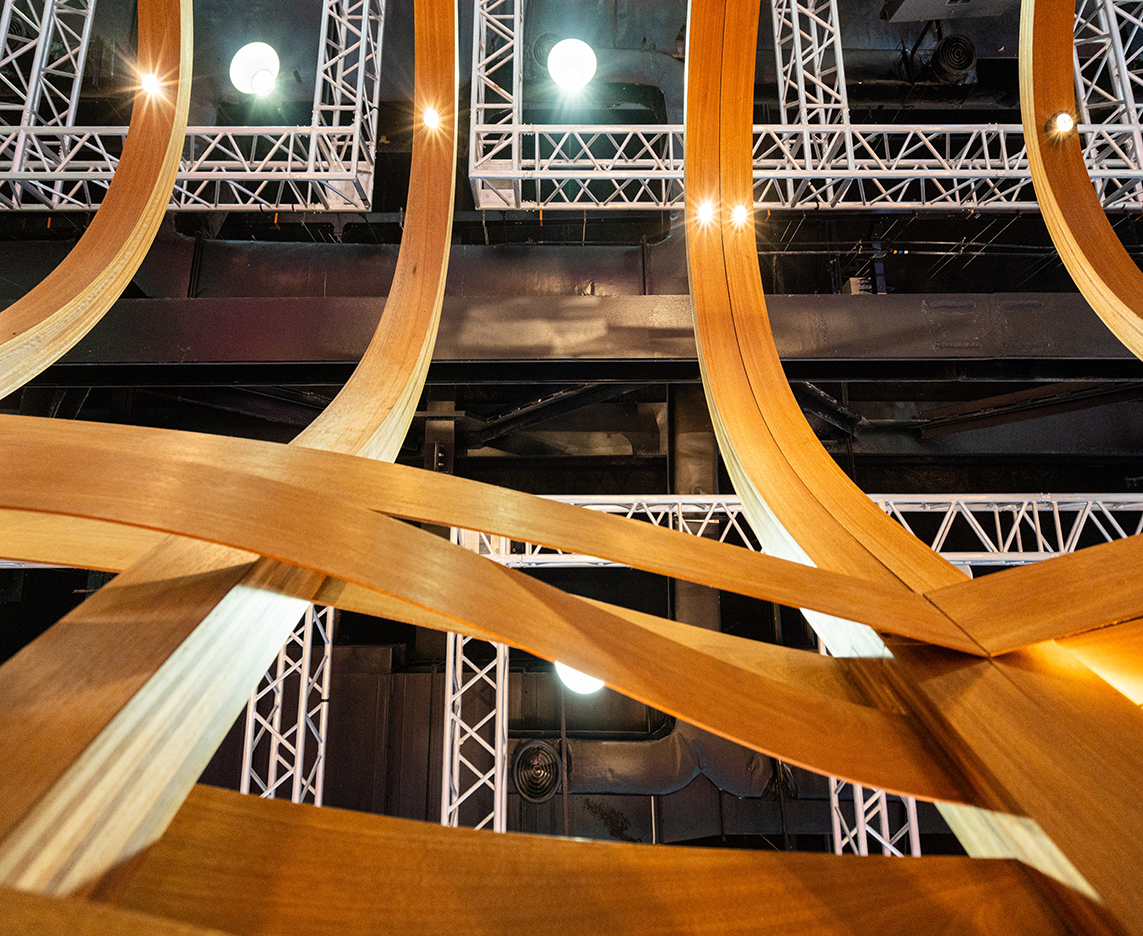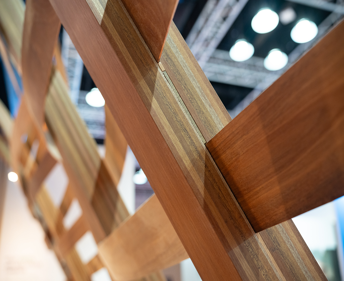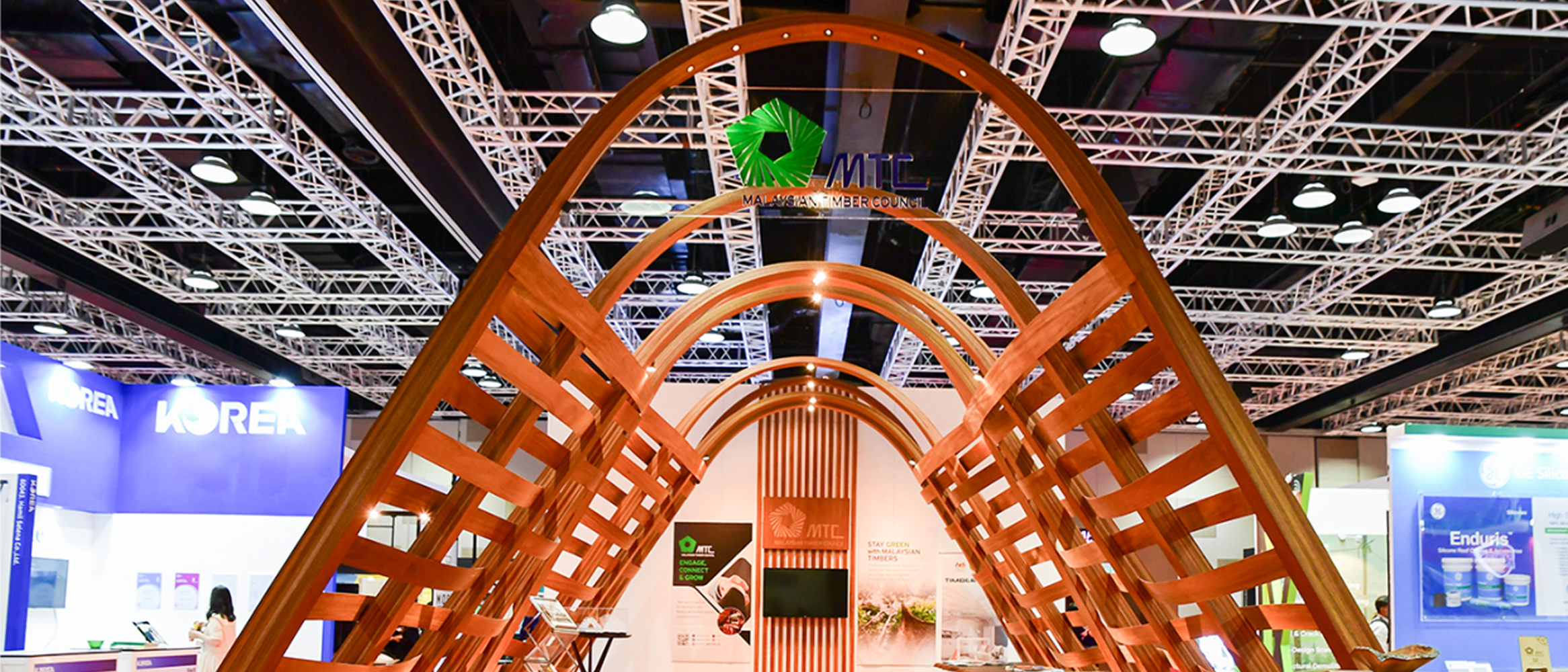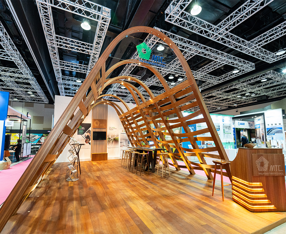 Weaving Waves is a 60-square-meter exhibition booth for the Malaysian Timber Council, inspired by traditional Malay weaving. Featuring ten curved ribs of Melunak timber, the shell-like structure highlights the material’s versatility and craftsmanship. Its flowing form creates a mesmerizing interplay of light and shadow, blending tradition with innovation. This dynamic installation celebrates sustainable timber applications, modular design and connecting heritage with modern design to inspire and educate.